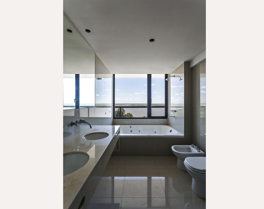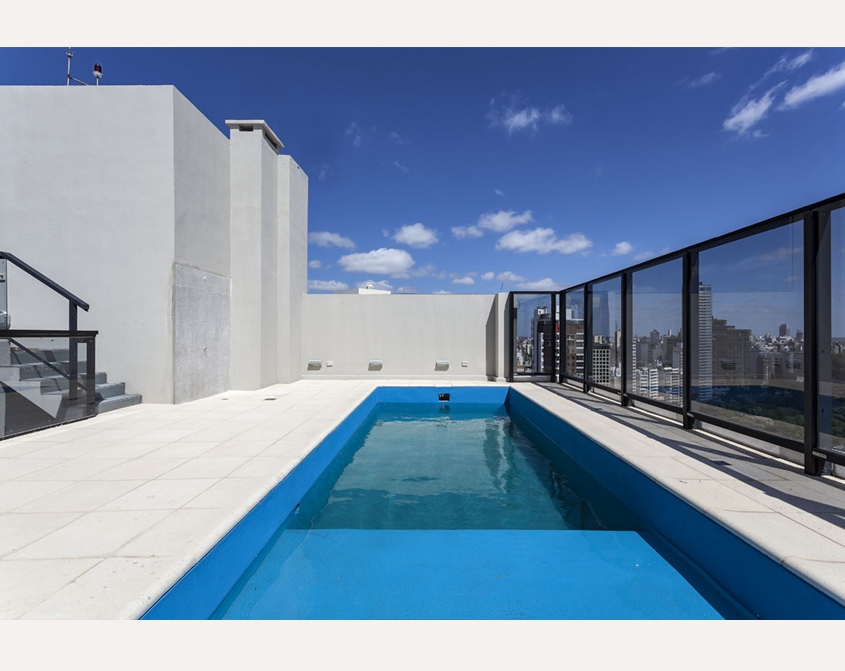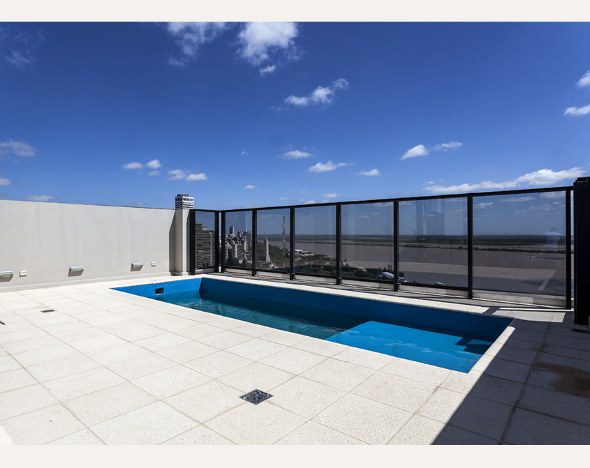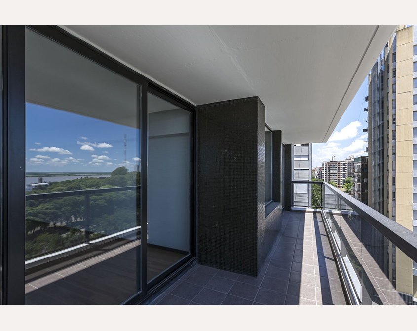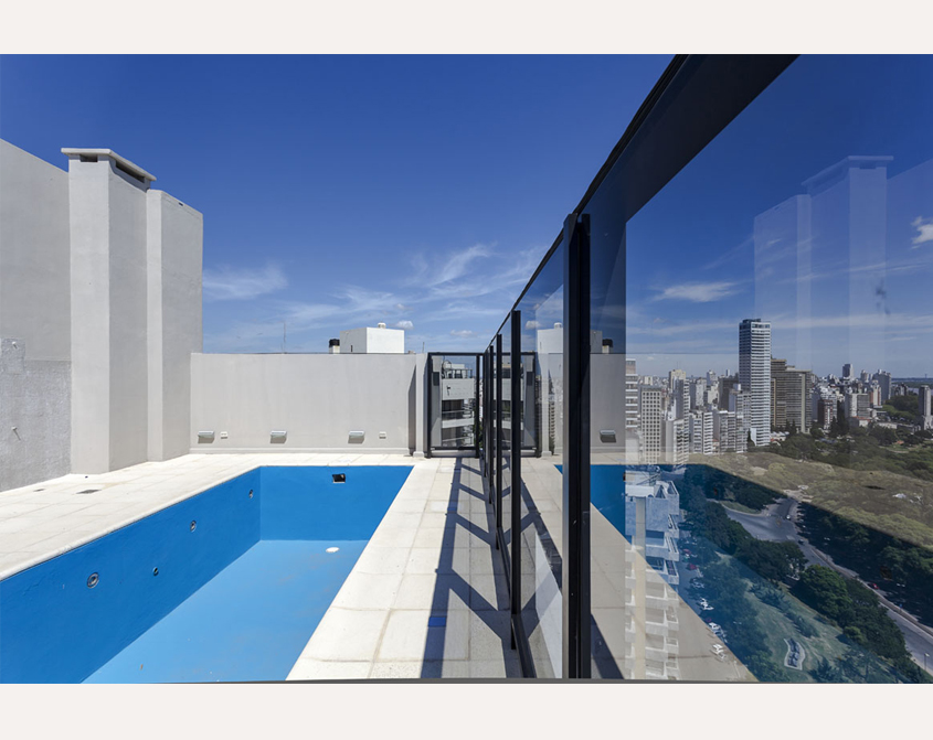 Posee además espacios de recreación con vista panorámica al Paraná en piso 20 y 21: piscina con solarium y salón de usos múltiples con parrillero, comodidades para cocinar y baño. Hay cocheras en planta baja y tres subsuelos y bauleras opcionales.
